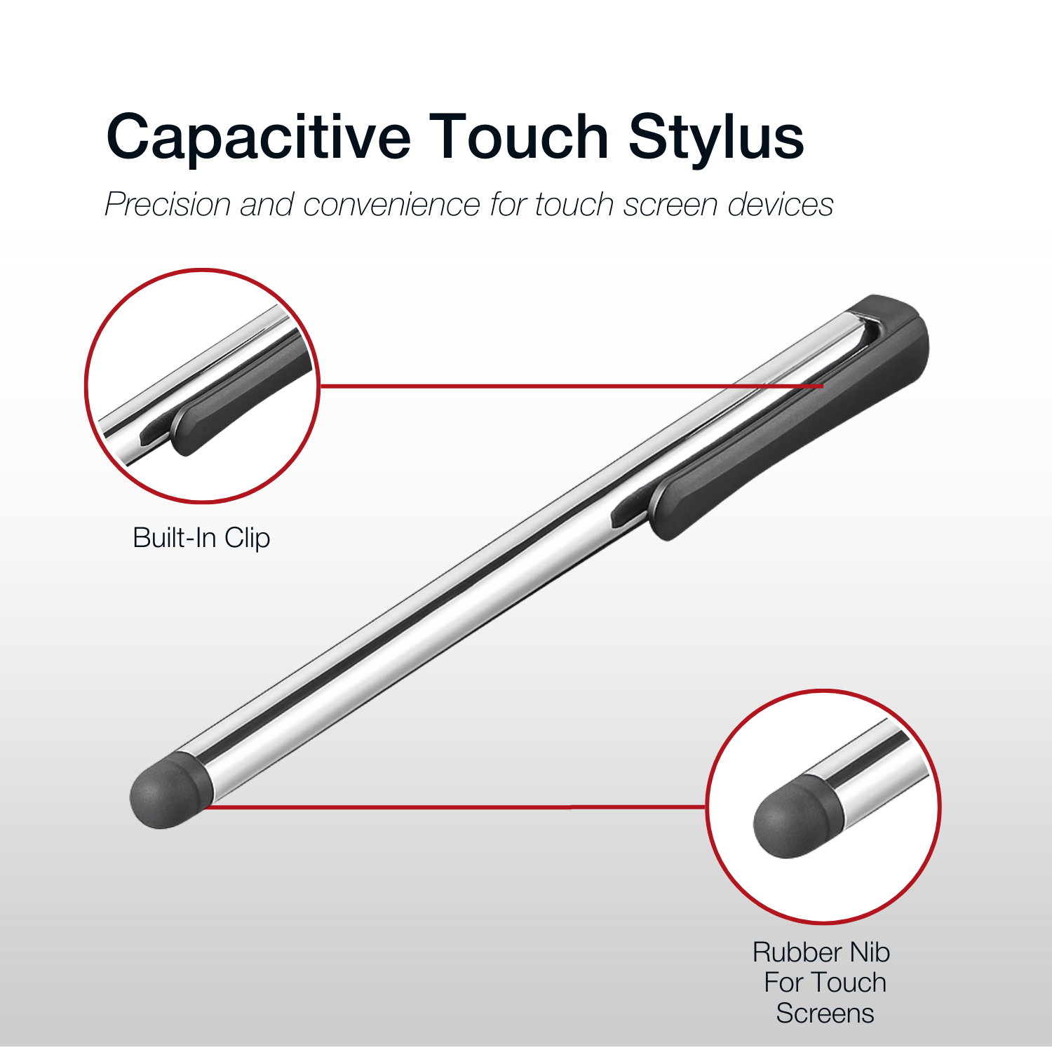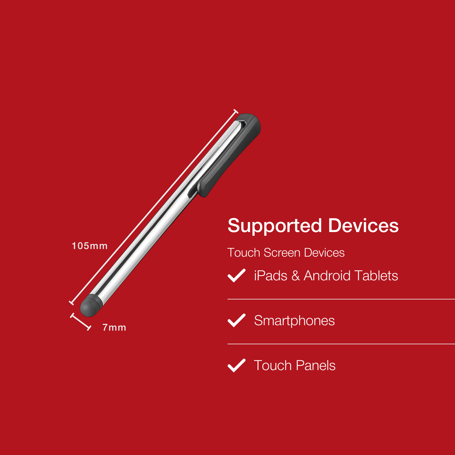 The Shintaro Capacitive Touch Stylus (Model: 15SHSTYLUS) is designed for use with all capacitive touch screens, including iPads, iPhones, Samsung Galaxy devices, and tablets. This precision stylus offers a comfortable grip, enhancing your ability to navigate, draw, or take notes on your touchscreen devices. It features a built-in clip for easy storage and portability, making it a practical accessory for both home and travel. With dimensions of 105mm in length and a diameter of 7mm, this stylus provides a balance of functionality and convenience, ensuring you can interact with your devices effortlessly and efficiently.